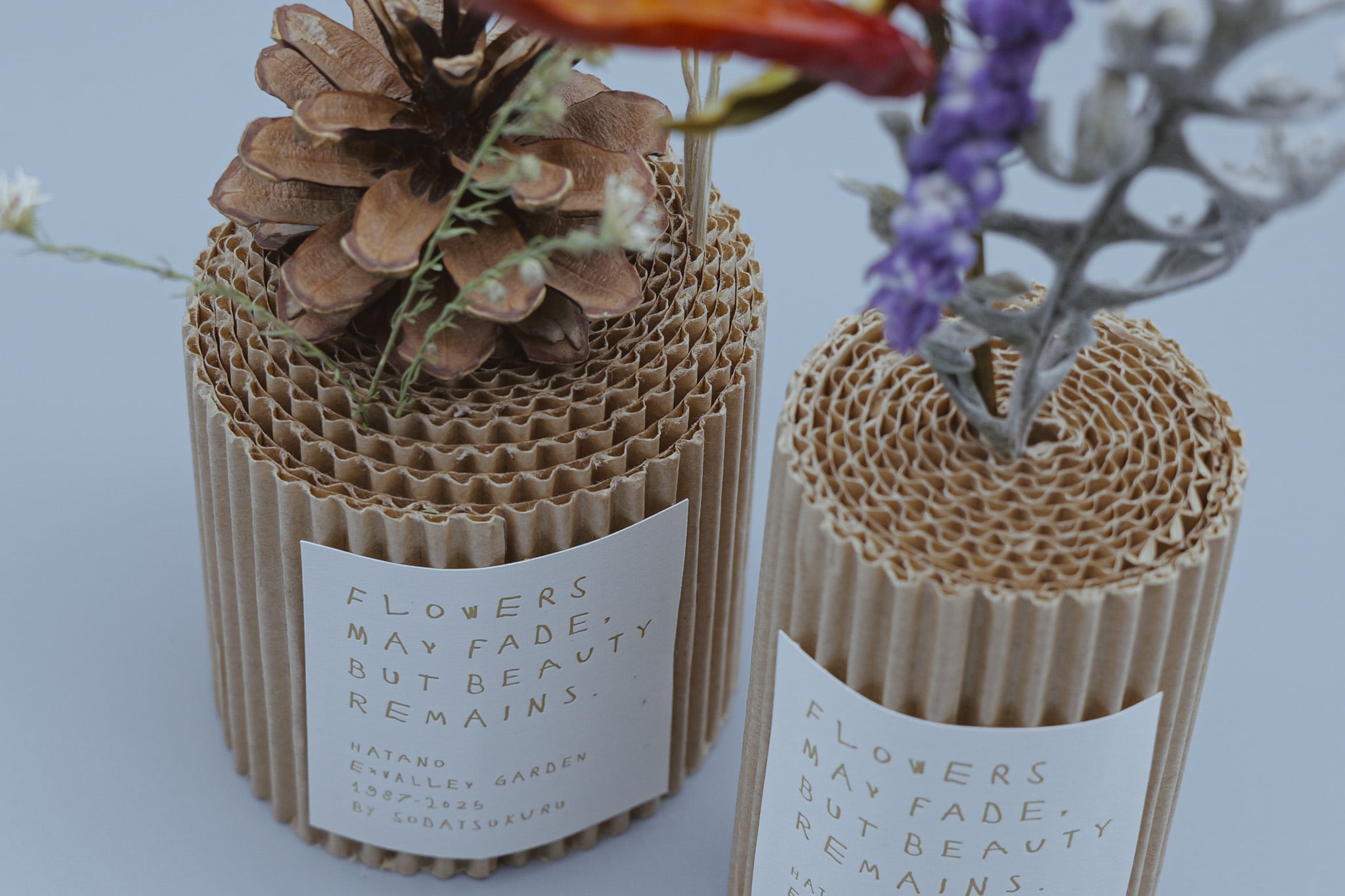 そのドライフラワーを、やわらかな フルート紙の器 と掛け合わせ、静かに佇む花器をつくりました。